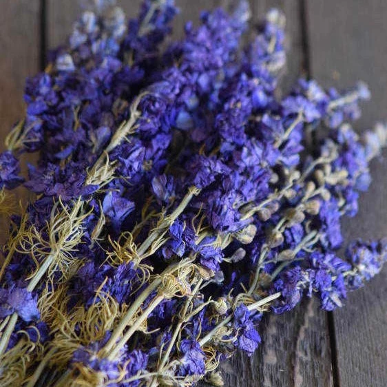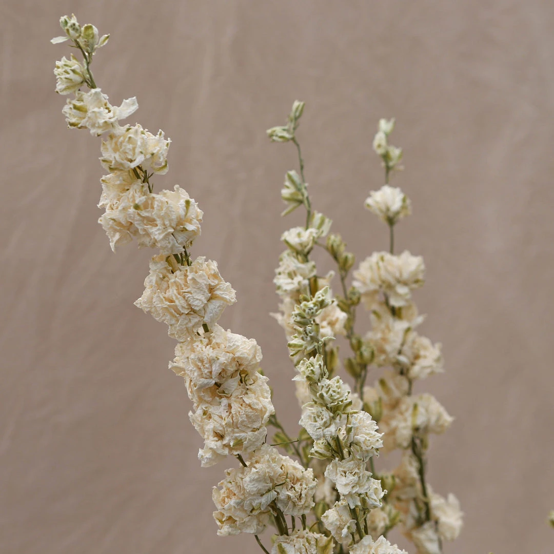 Delicate natural blue Delphinium flowers. Dried flowers are having a come back and are a more cost effective solution to bring nature into your home than buying fresh flowers each week. These beautiful and elegant flowers are great mixed with other dried flowers in a bouquet or use on it’s own for a simple contemporary display.