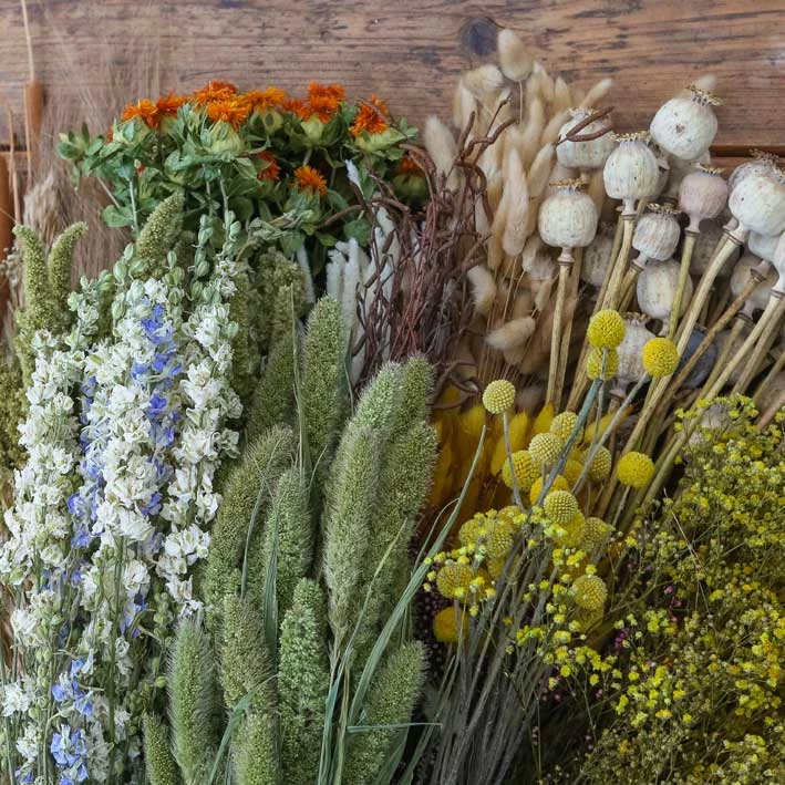 Care for dried flowers: Keep out of direct sunlight as this can cause the colours to fade and avoid water as moisture can make them wilt. Occasionally use a soft brush to remove any dust.