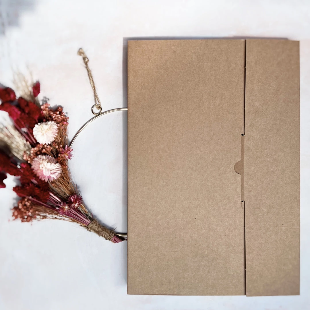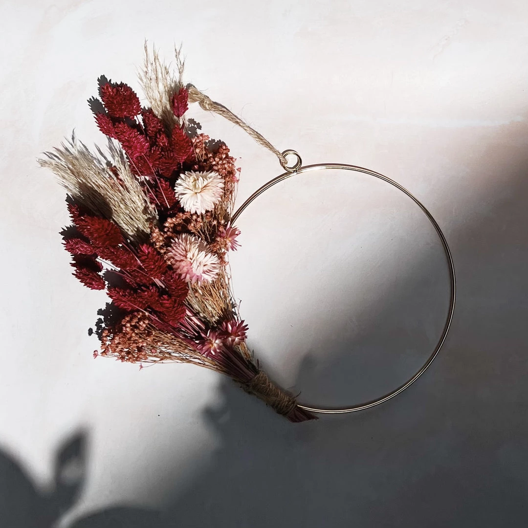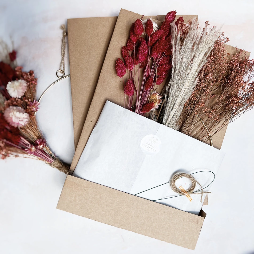A beautifully curated kit for making a wreath, containing a mix of pink naturally coloured florals, a metal ring, wire and string.