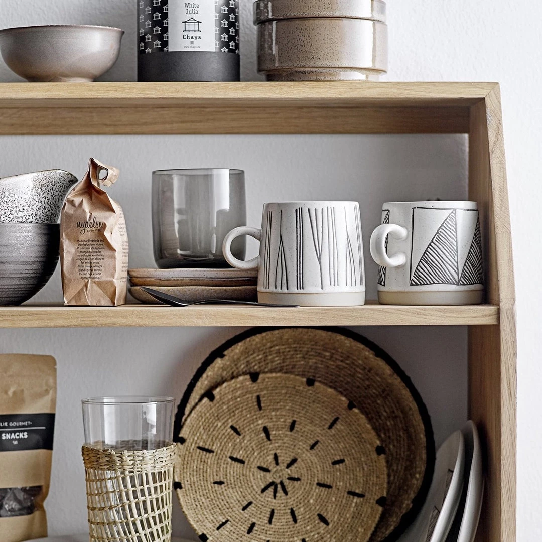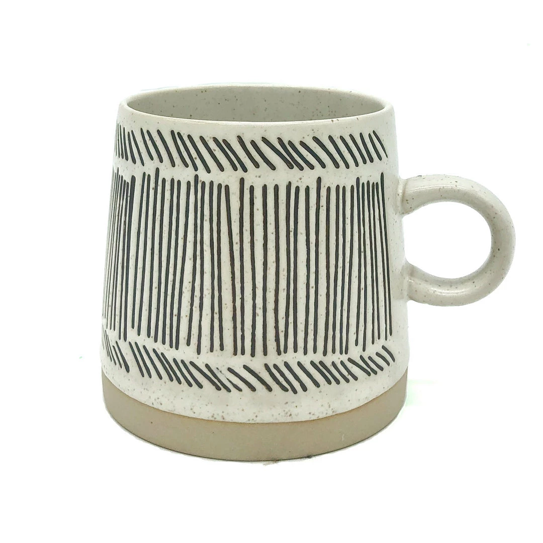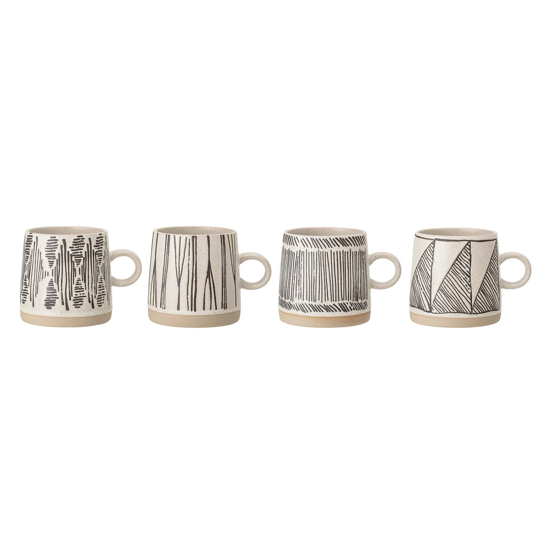 Beautifully designed stoneware mugs with four varied patterned handrawn line detail in black.
