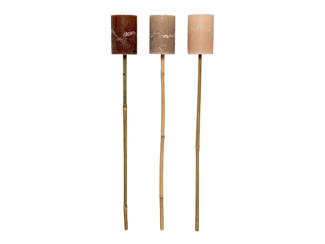 Neutral pillar candle torch on bamboo stick for outdoors.