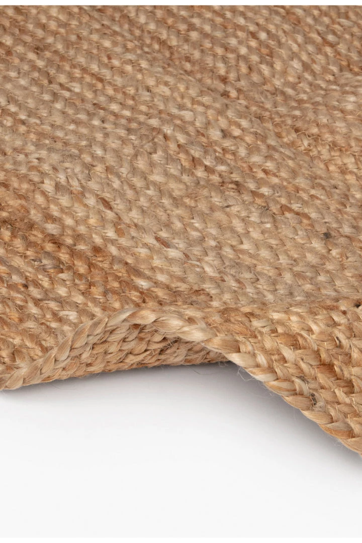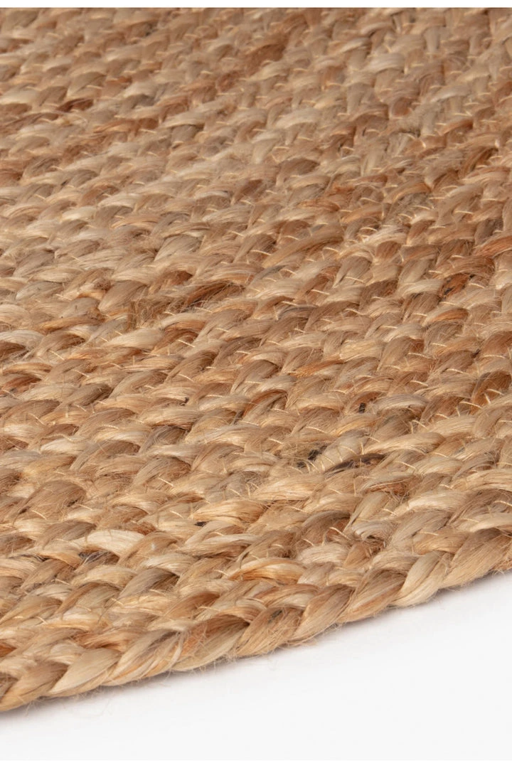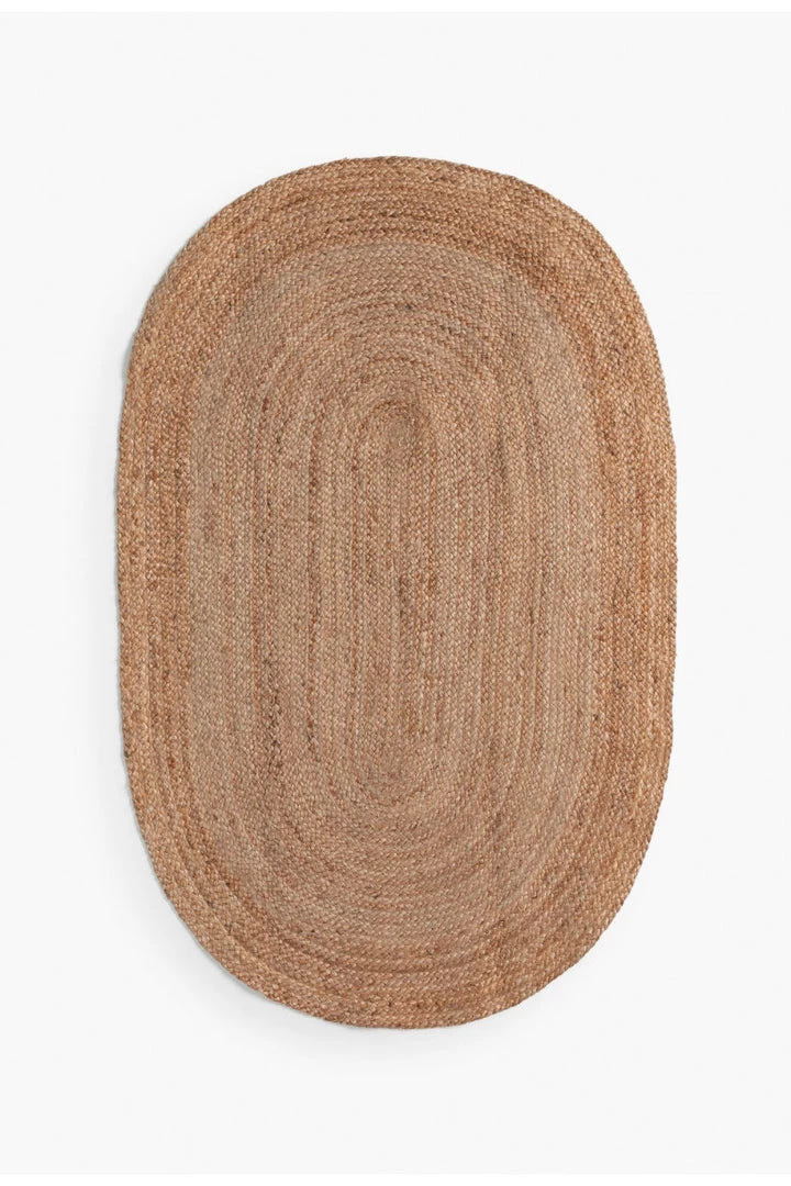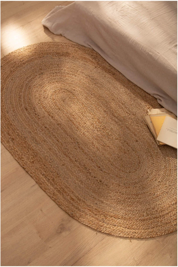 A natural jute rug in an oval shape, perfect as a doormat or a bedside rug.