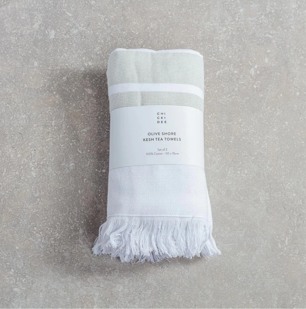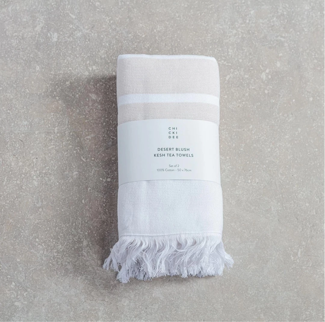 Add a touch of luxury to your kitchen with a set of 2 100% cotton Kesh tea towels. Desert Blush or Olive Shore colour on one side and lined with towelling on the other these beautiful towels are quick drying and hard wearing. Set of 2.