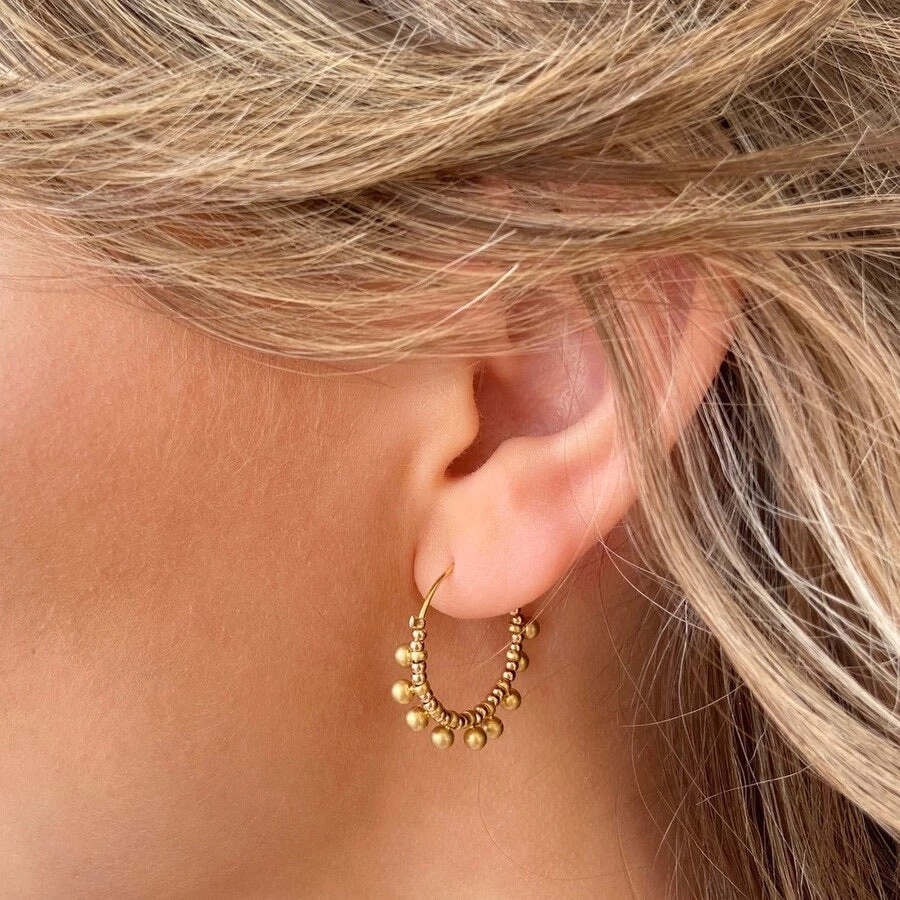 These gorgeous gold hoops are the perfect boho jewellery pieces for finishing off your look or giving as a gift for a friend who loves gold jewellery! Featuring small slim hoops threaded with tiny round beads and matte gold ball charms, complete with simple hook and latch fastenings to secure.
