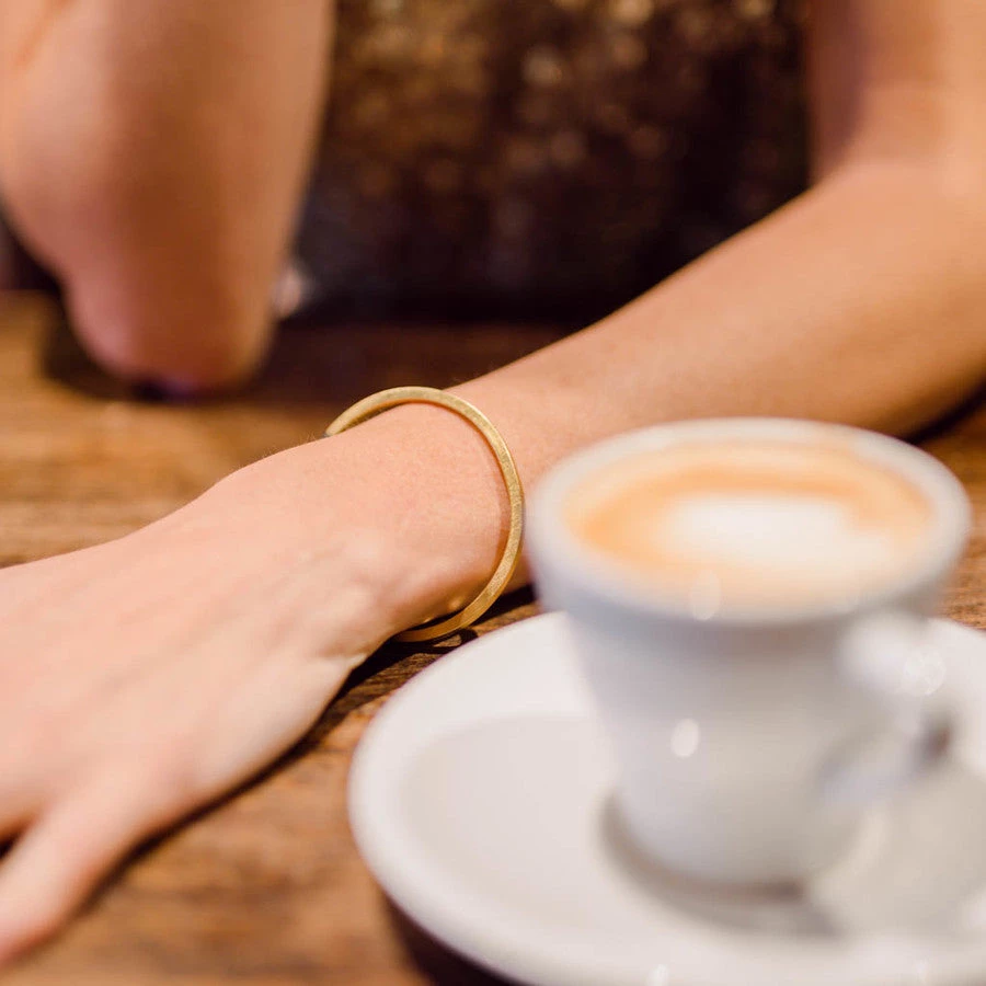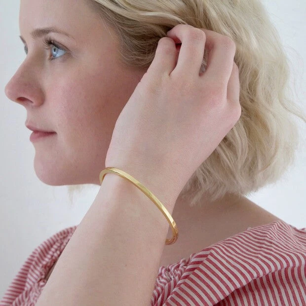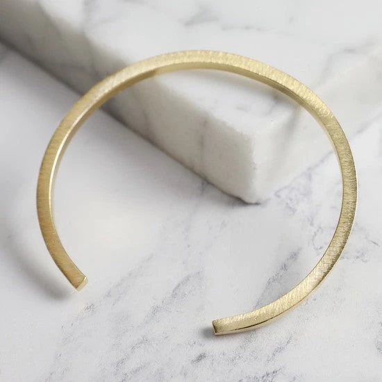One of our favourites, this delicate yet sturdy bar bangle makes a wonderful present. With a brushed gold finished, This bangle is adjustable; it can be flexed slightly more open or closed to fit your wrist however you find most comfortable.