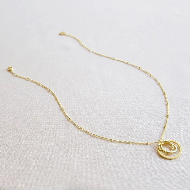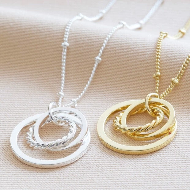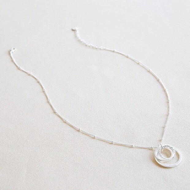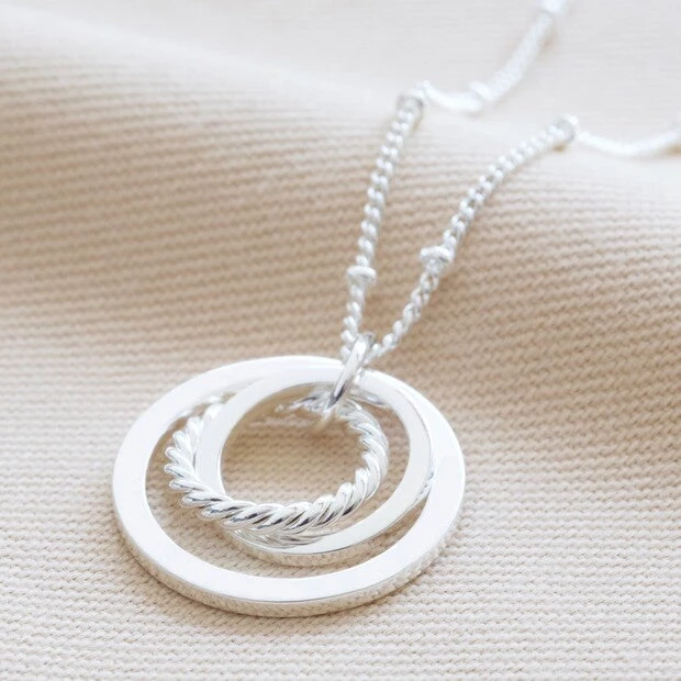 Made from sterling silver plated brass, this ladies’ necklace features a pendant of three rings of different sizes and finishes. Attached to a satellite chain with a lobster clasp and extender chain to secure.
