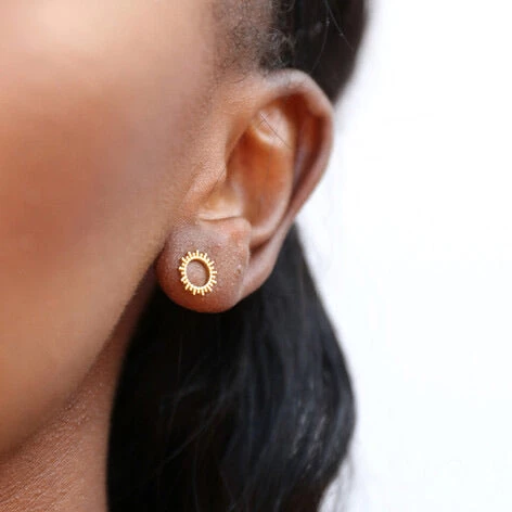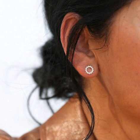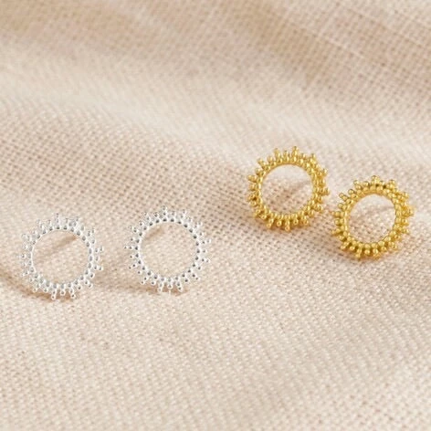A pair of small stud earrings in hypoallergenic sterling silver, featuring dotty sunshines fixed to posts. Fasten these gorgeous silver earrings via the butterfly push backs.