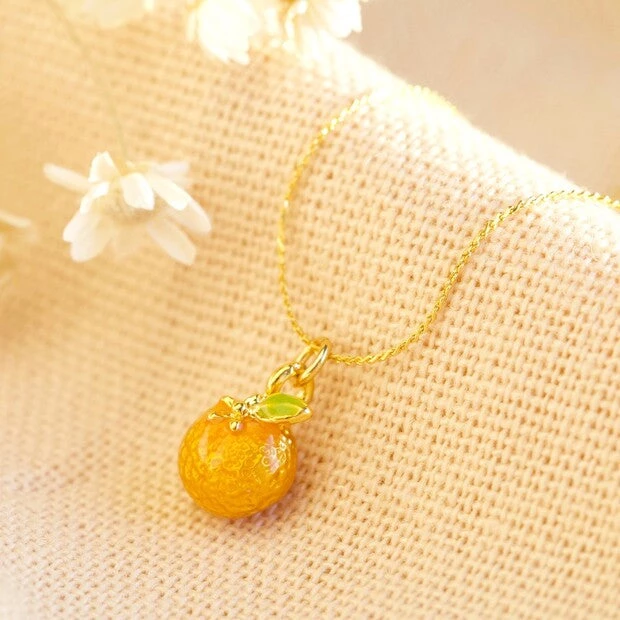 Featuring a tiny orange shaped pendant, detailed with shining orange and green, suspended from a fine chain which fastens via lobster clasp and extender links. A delicate jewellery gift for fruit fans and lovers of warm summers!