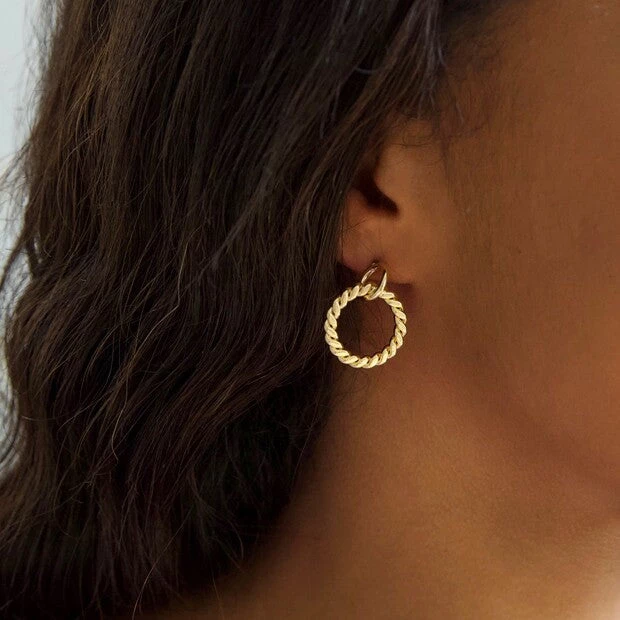A pair of statement drop hoop earrings, this pair feature a smooth gold plated classic hoop with a twisted 18ct gold plated hoop hanging from the bottom. Each earring secures via a gold plated sterling silver posts and butterfly push function and are perfect to wear with other golden jewellery pieces.