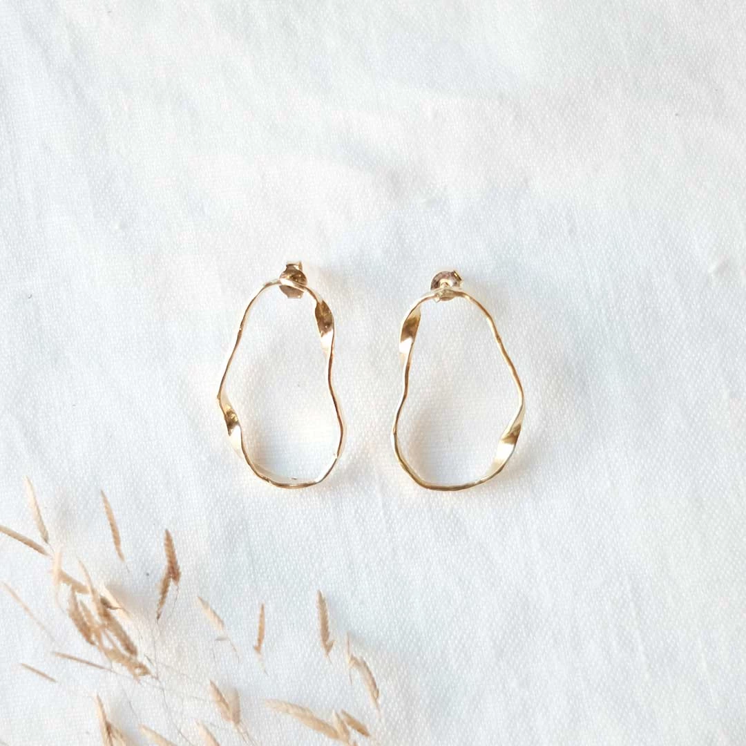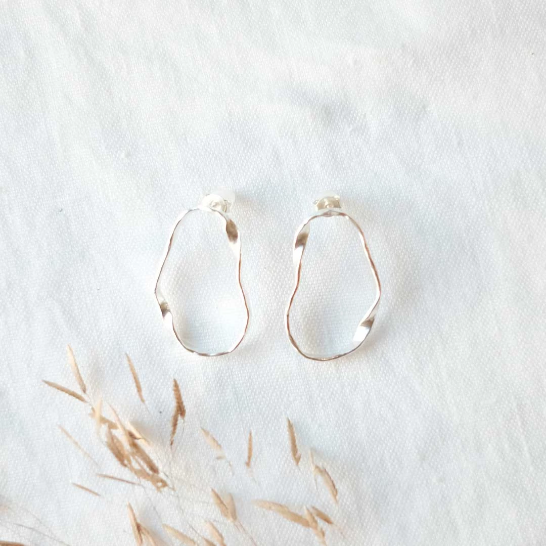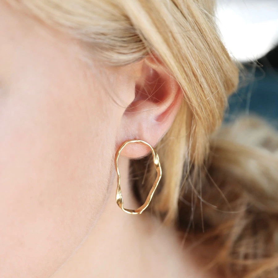 A unique design statement earrings available in silver and gold. The earrings feature an irregular circle outline in a wavy style, like a loop of dangling ribbon, fixed to hypoallergenic sterling silver posts at the top.