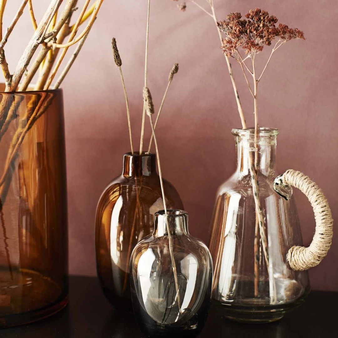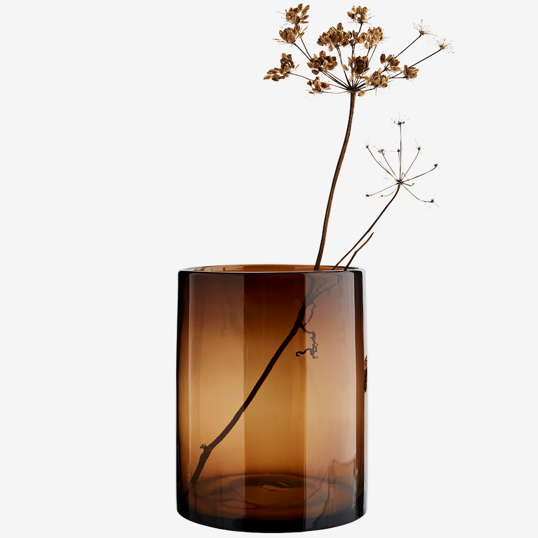A stylish amber colour glass vase has a wide base suitable for large flower arrangement. Simple form vases have an elegant feature in both classic and modern interiors. A staple for any home.