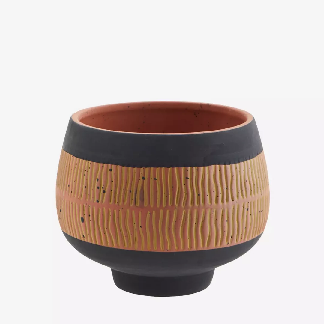 Striking matt black & patterned glaze on this terracotta plant pot.