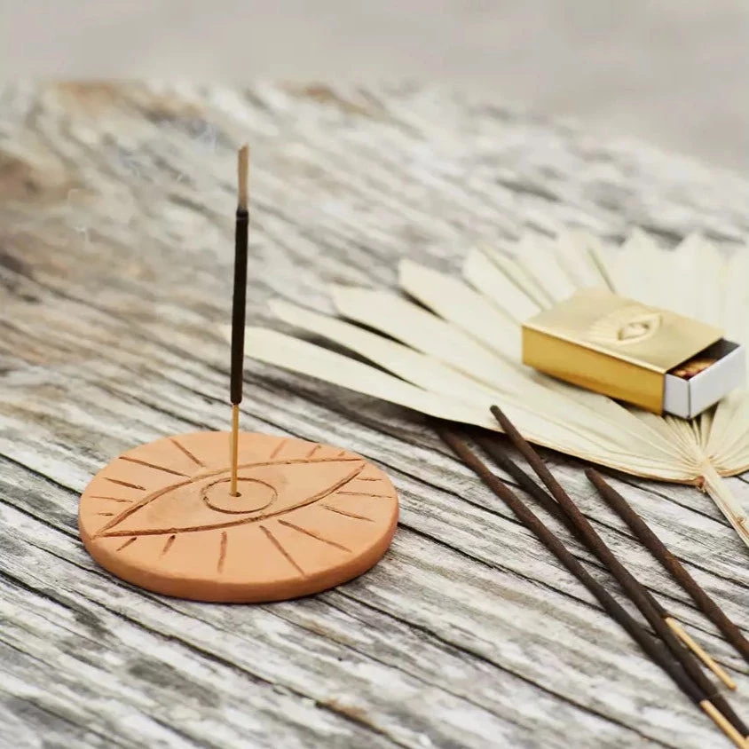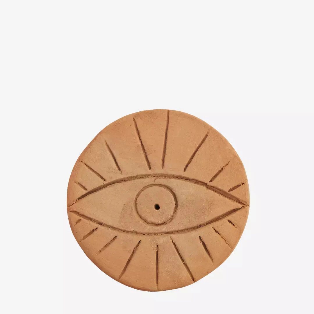 Terracotta Incense Burner with eye design. Catches all the incense dust and provides a sweet stand for your favourite sticks to burn.