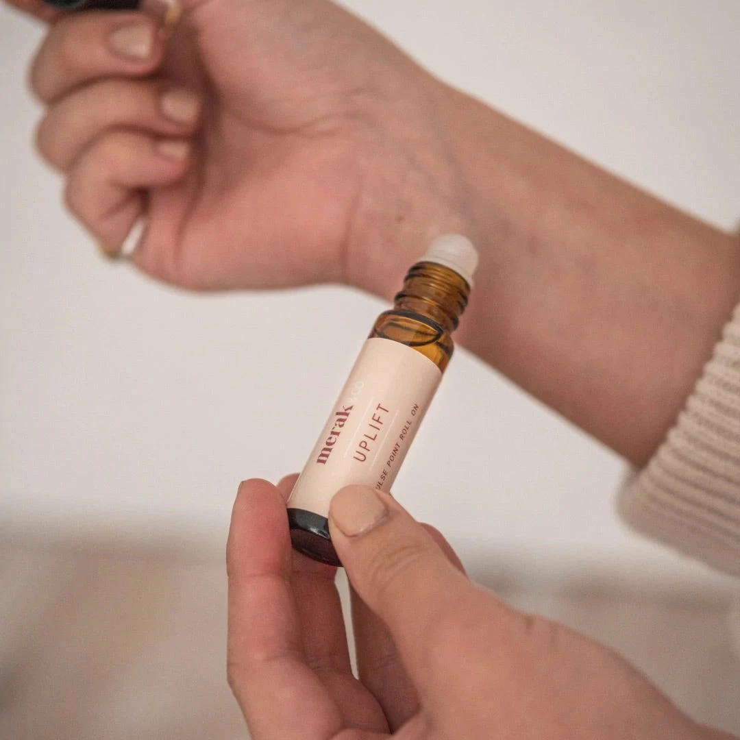 – Roll onto your desired pulse points; wrists, temple, forehead, neck, behind the ears or bottom of feet.