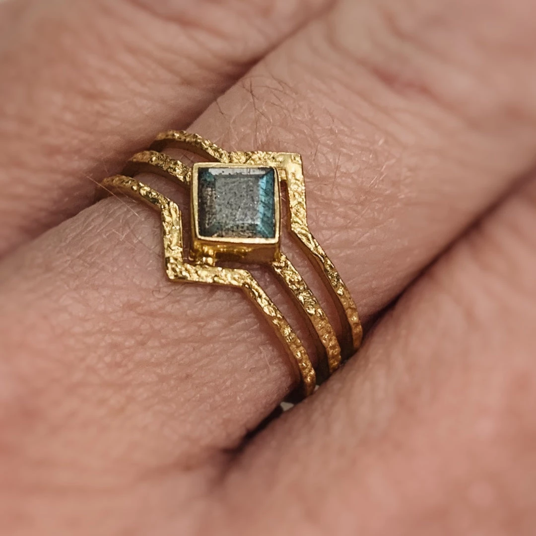 Beautiful handmade gold plated ring with 3 bands and a diamond shape labradorite stone.