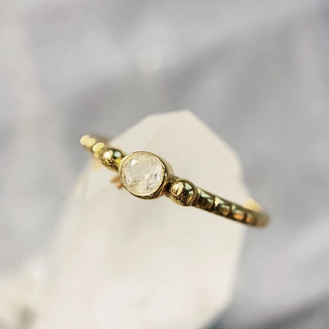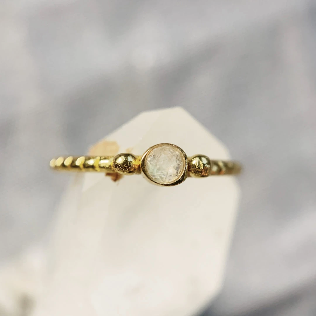 Beautiful handmade gold plated ring set with a white moonstone and dots detail band.