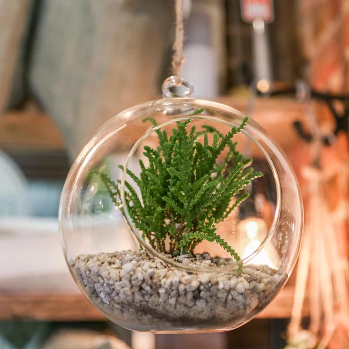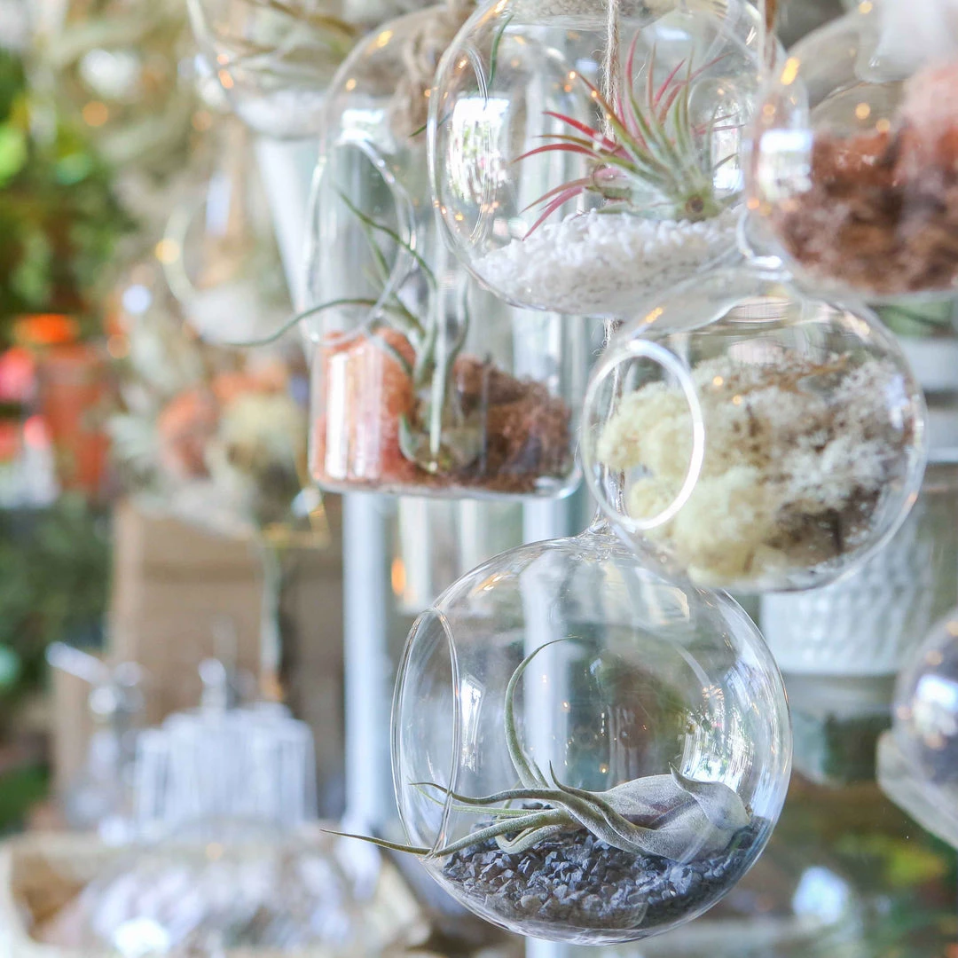 Delicate glass spheres, perfect for displaying air plants (Tillandsia). These come supplied with natural jute string that you can knot or cut to length to hang at the desired height. They look especially effective grouped together in a window.