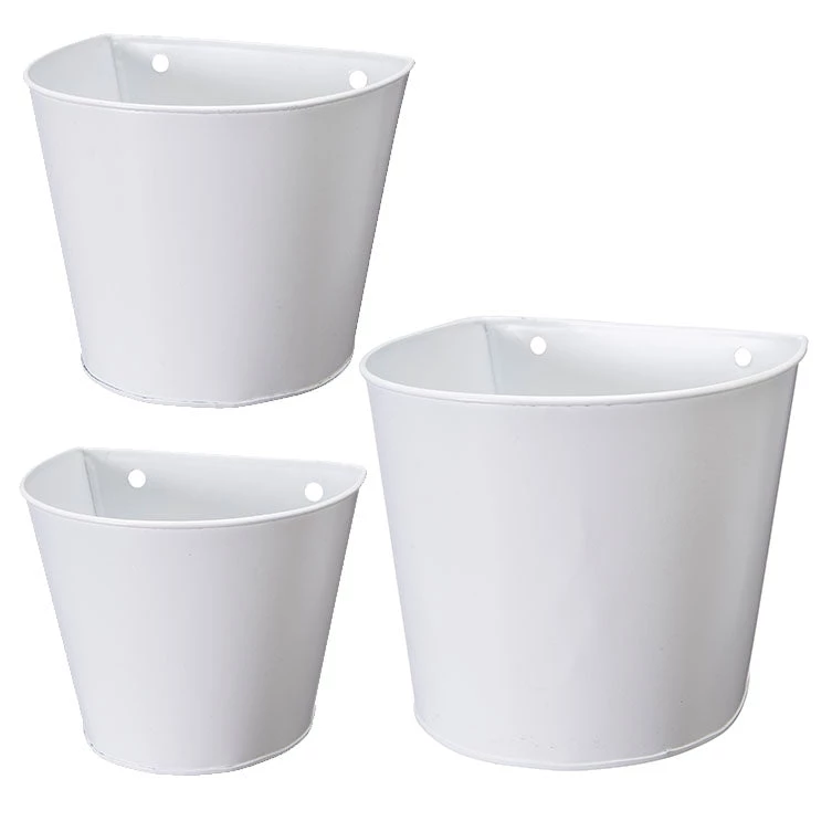 White metal wall mounted plastic lined hanging planters.