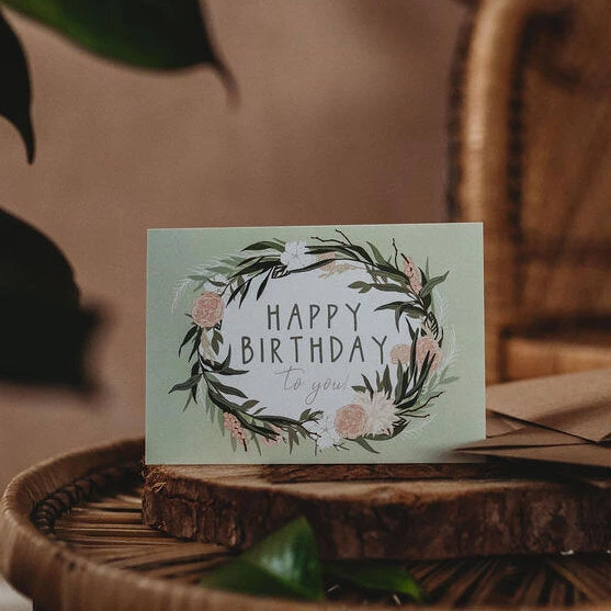 A beautiful wild botanical wreath on a crisp mint background birthday card with a kraft brown envelope.