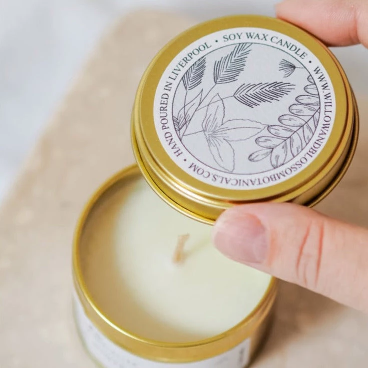 Beautiful 100ml gold tin candles with hand drawn botanical labels